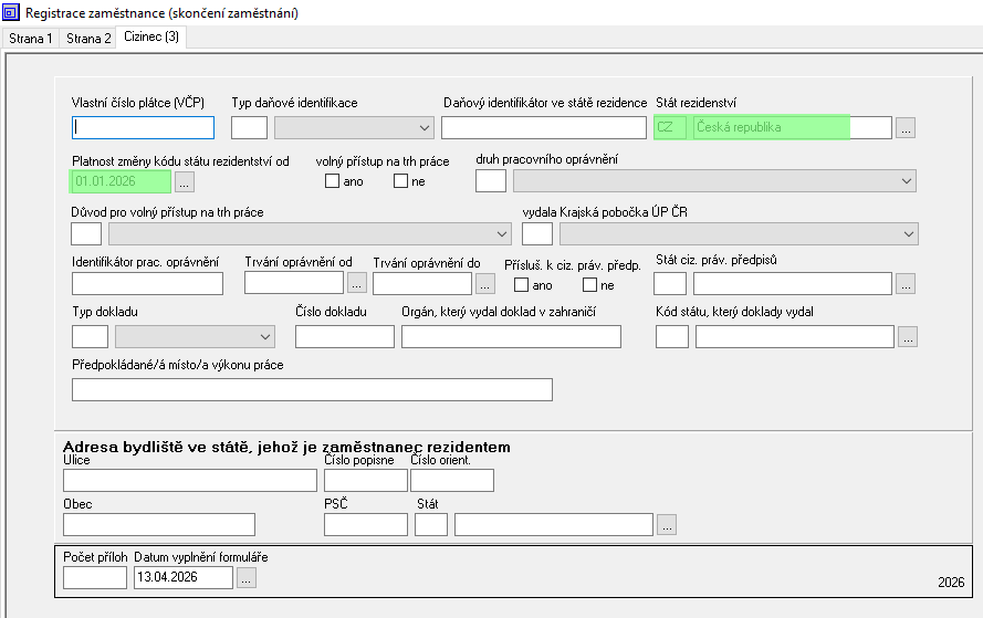 Na ČSSZ musíte doregistrovat všechny zaměstnance, kteří měli v roce 2026 pracovní poměr. Tato doregistrace se provádí na novém formuláři RegZec, který naleznete ve Výkazech - kategorie Jiné - určení Sociální - Registrace zaměstnance. Při doregistraci vyplníte Typ akce: 3 - Změna údajů a zakliknete volbu Prvotní doregistrace. Všechny níže uvedené zelené kolonky musí být vyplněny - jedná se o povinné údaje.