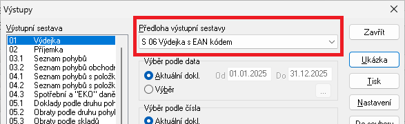 Po rozbalení seznamu předloh výstupních sestav vyberte předlohu, která nejlépe vyhoví Vašim požadavkům. Obvykle má i stejný či podobný název, případně stejné číslo, ovšem bez písmena "S" na začátku.